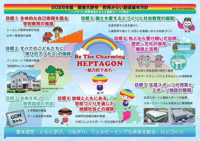 2026度の基本方針は、「ともに学び、つながり、ウェルビーイングな未来を創る、ひとづくり」を基本理念とし、小中一貫教育の成熟をめざし「地域とともにある学校づくり」をメインにした「地域とともにあるヘプタゴン教育」を継続して推進していきます。