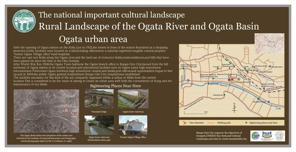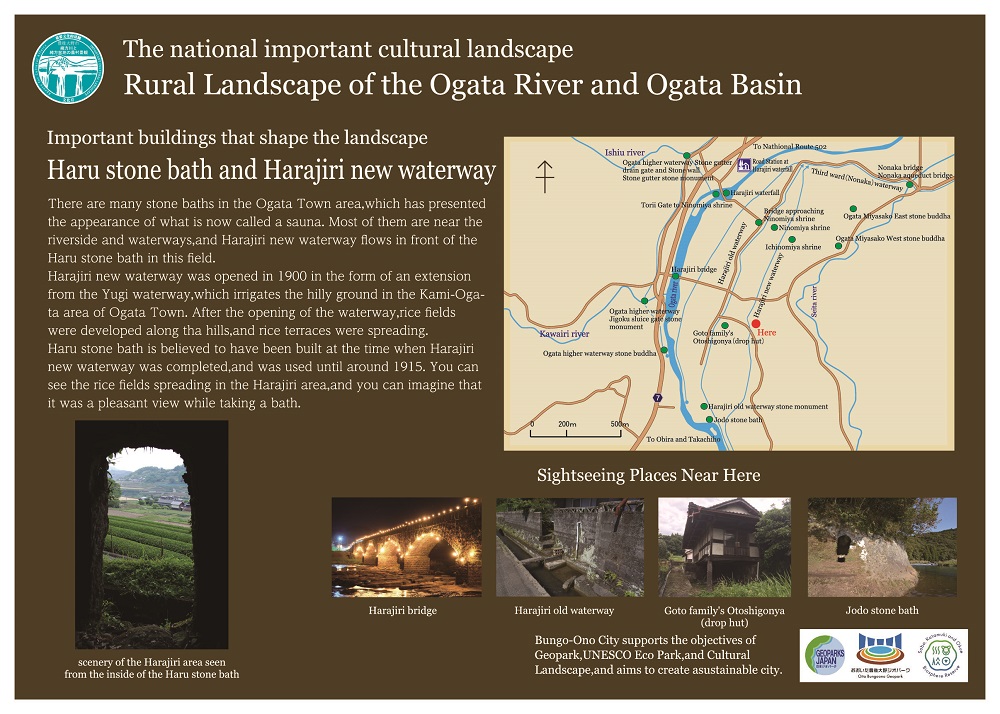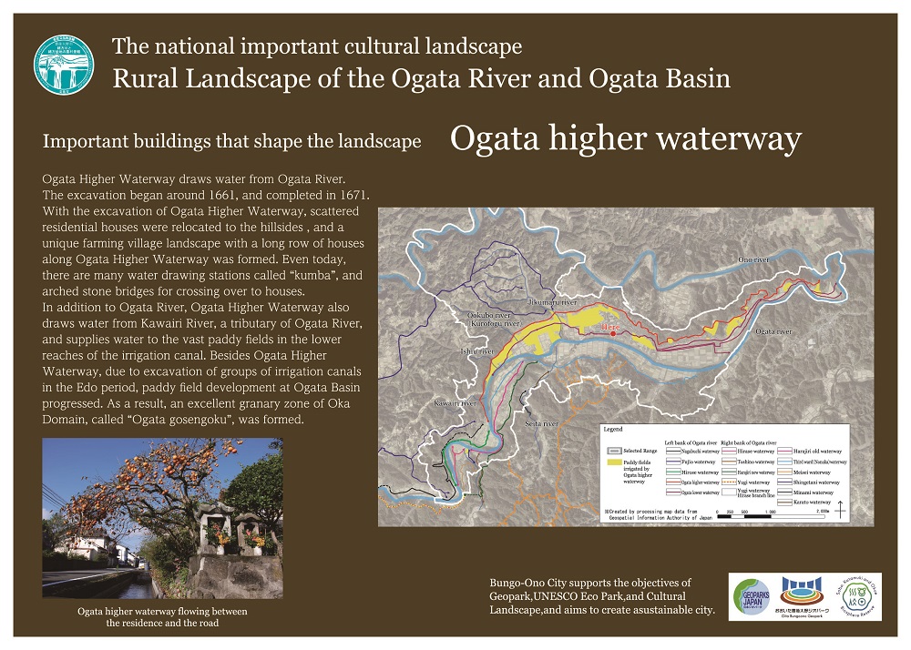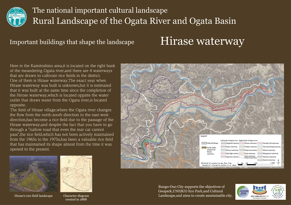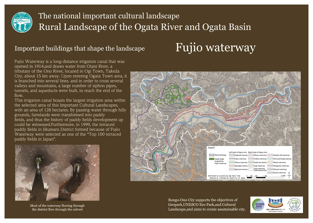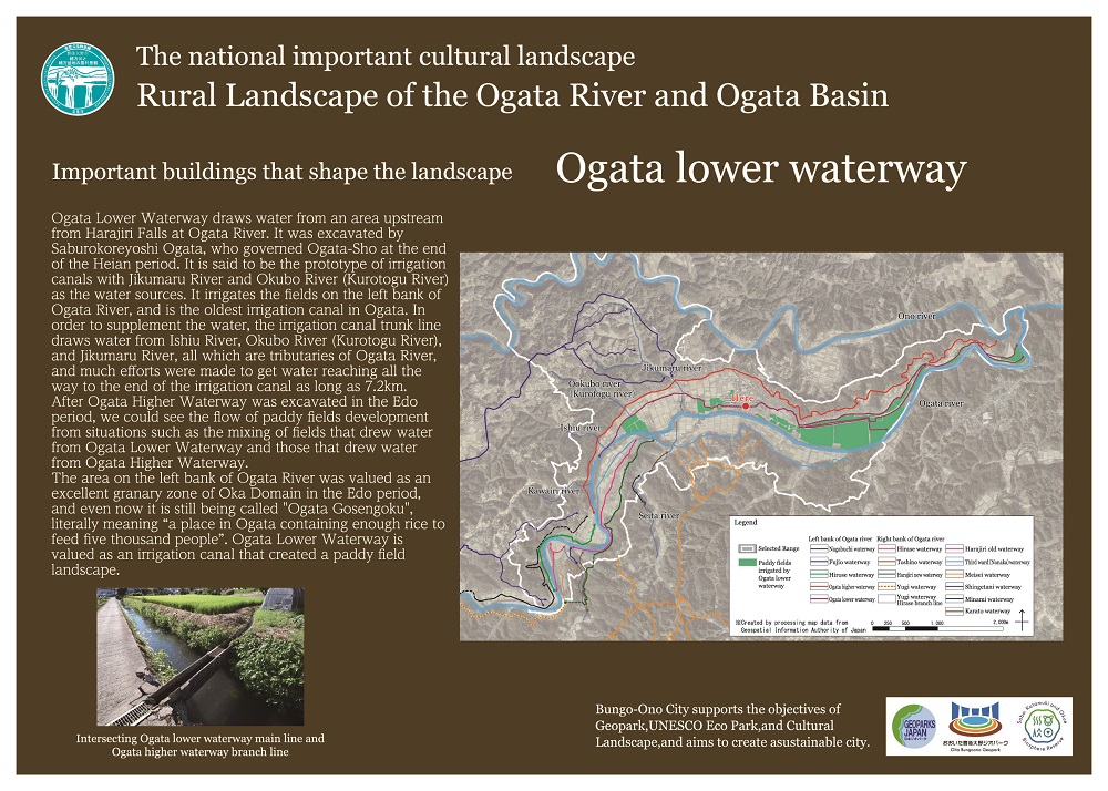 豊後大野市の西部に位置する緒方盆地は、阿蘇火山由来の溶結凝灰岩が覆う丘陵地帯に位置する。盆地中央を蛇行する緒方川の侵食により形成された河岸段丘は、丘陵地帯にあって稀有なまとまった平地であるが、川面と大きな高低差がある。そのため緒方盆地では、古くから灌漑用水を得るための努力が行われており、平安末期には緒方三郎惟栄により低位段丘を潤す井路が、近世には岡藩により中位段丘を潤す井路が整備され、藩屈指の稲作地帯となった。近代には、丘陵上に長距離水路が整備され、高位段丘と丘陵部に棚田が開かれた。このように、水路開削により稲作地帯として発展を遂げてきた農村の変遷を伝える貴重な景観となっている。河川、水田、井路、集落、山林が連なる土地利用の維持、また、井路網や石橋、磨崖仏や石風呂等、人々が時代ごとの技術を用いて溶結凝灰岩を開発に生かし、生活と結びついた文化や信仰を育んできたことを伝える要素が至るところに残されている。