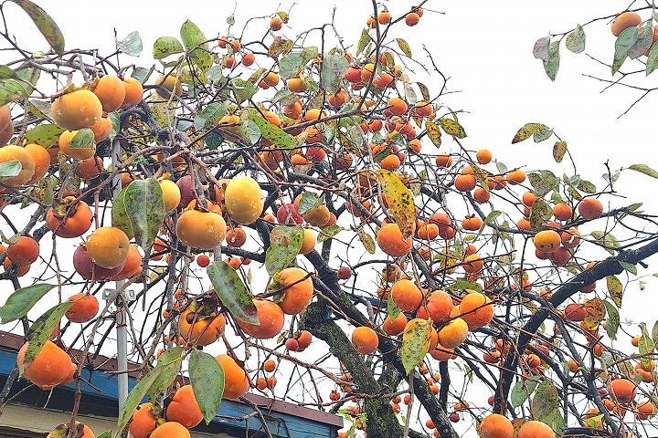今年豊作の柿もハロウィン色で児童をお出迎え