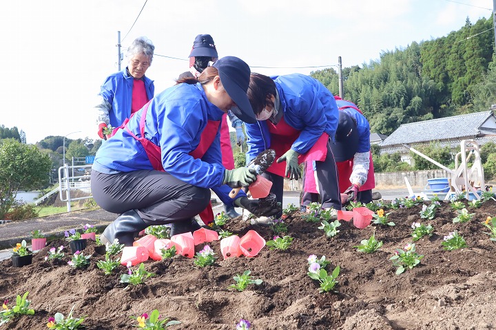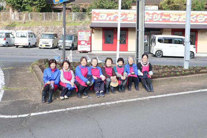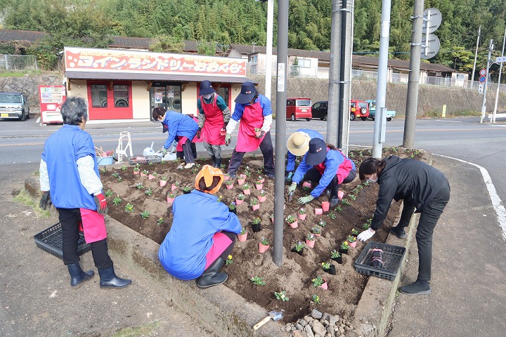 令和7年11月7日(金曜日)、豊後大野市商工会女性部千歳支部の会員さんが、県道の花壇の花植を行いました。