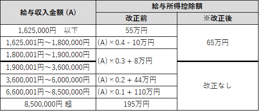 ①給与所得控除について、55万円の最低保障額が65万円に引き上げられました。