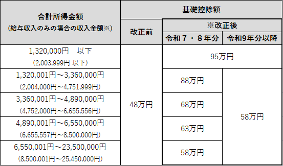 下表のとおり、合計所得金額に応じて、基礎控除額が改正されました。