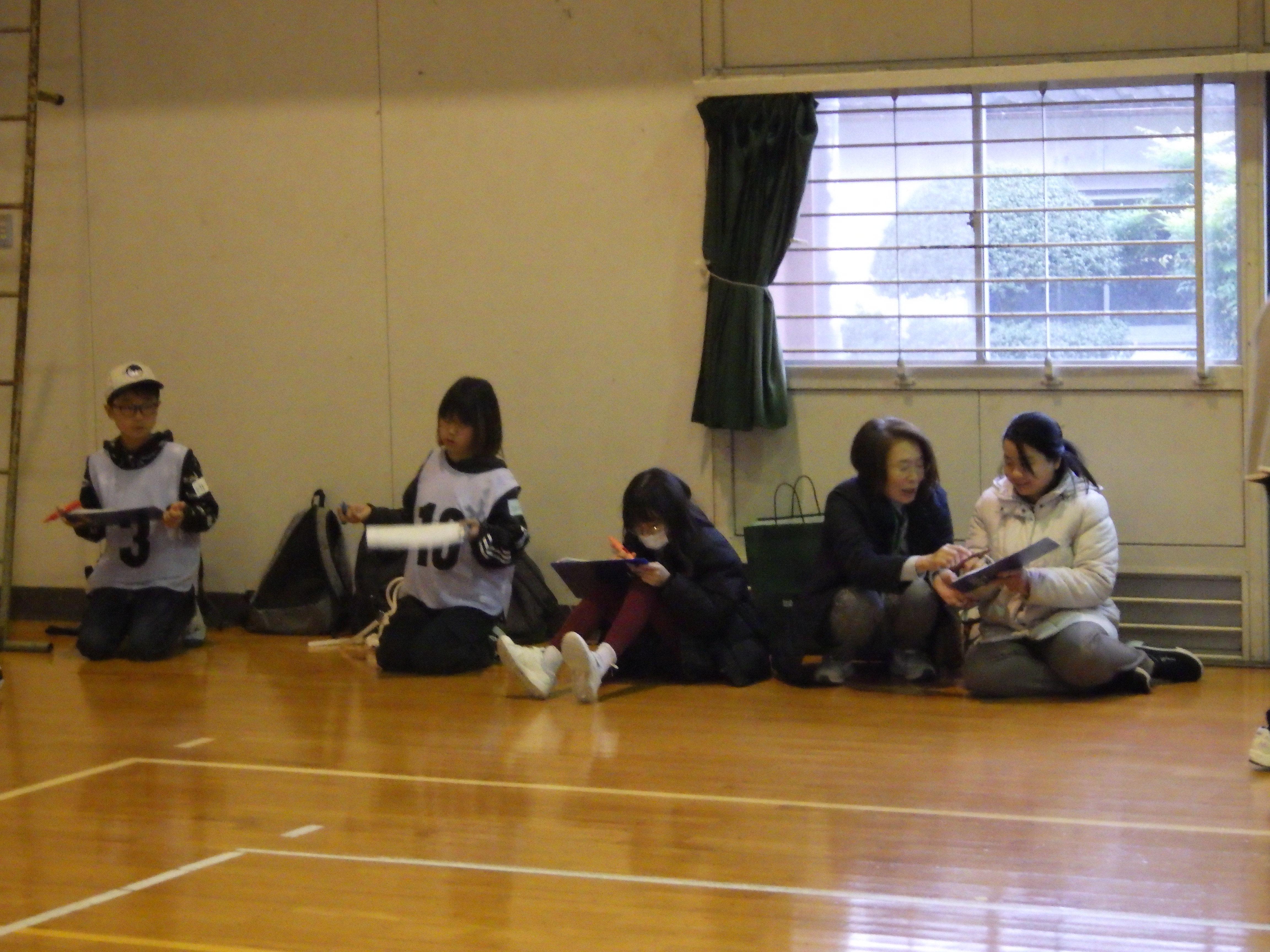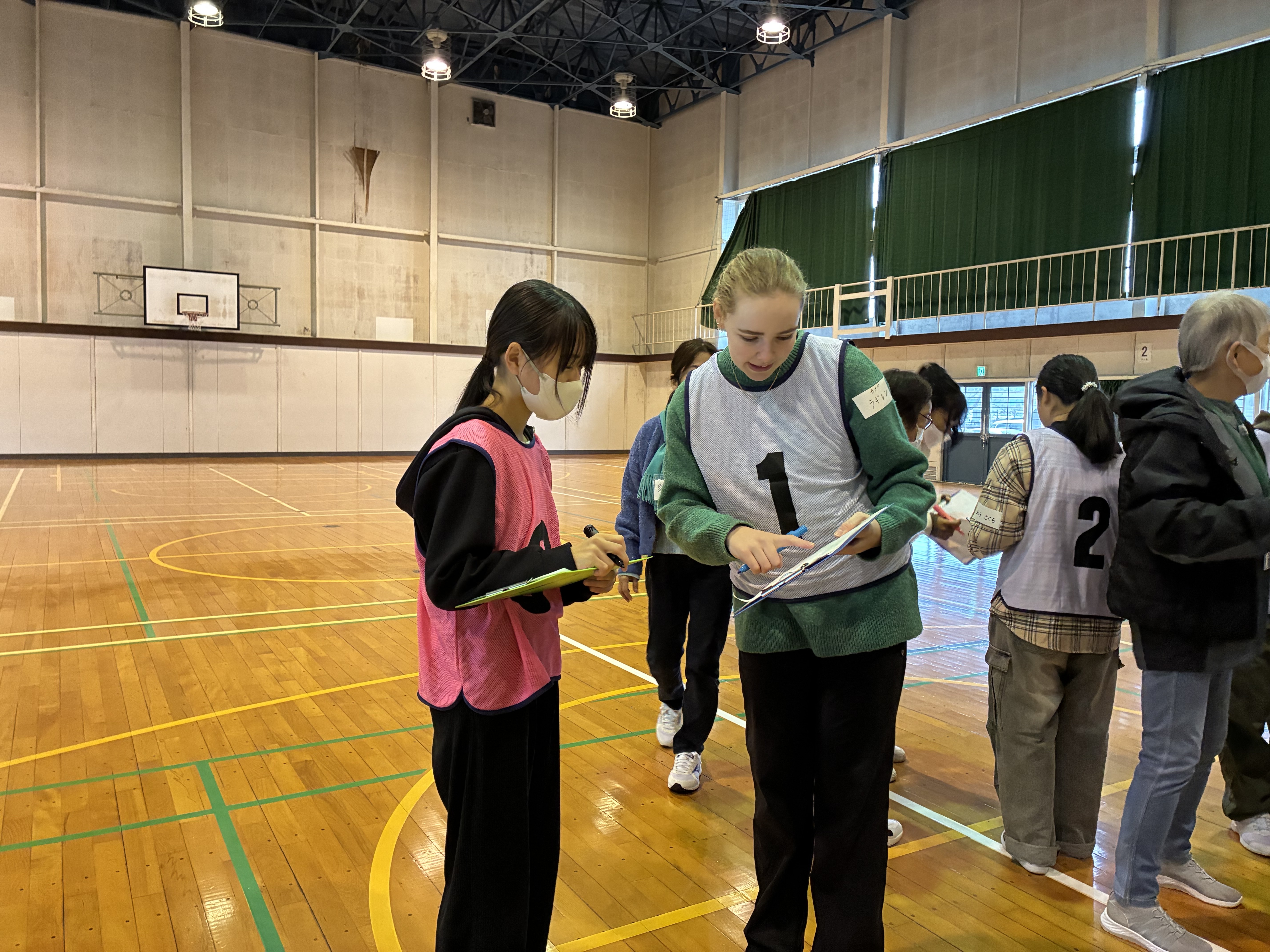 - 受付でくじを引き、青・白・ピンクの3チームに分かれ、それぞれの色のビーブスを着て開会式を迎えました。開会の前は、ゲームの事前準備で自己紹介カードを書きながら他の参加者と交流する時間を持ちました。まだ少し緊張している様子も💦