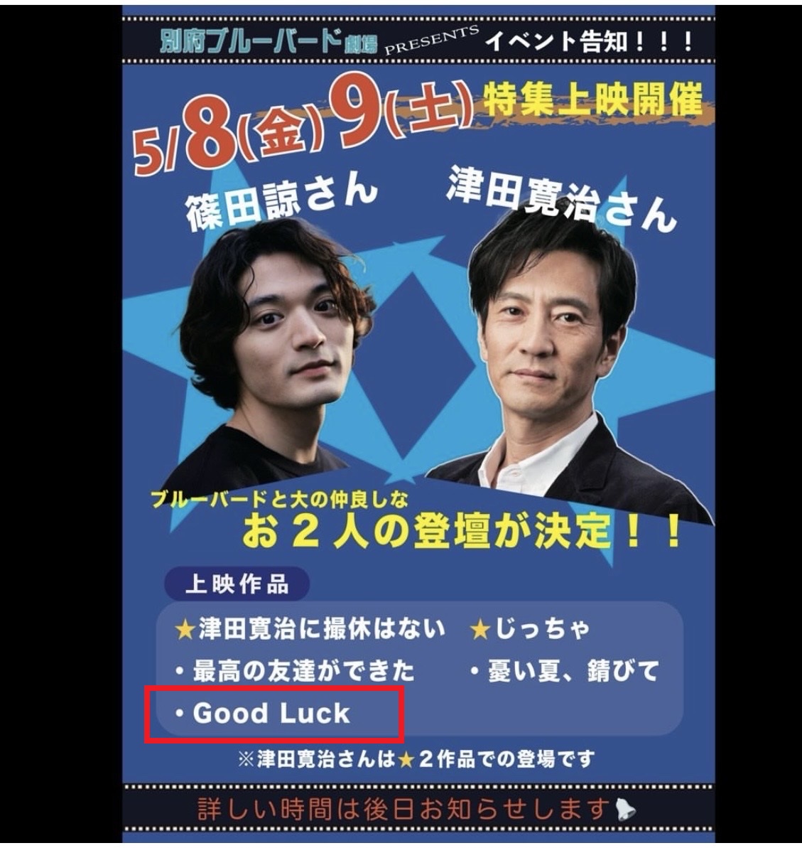 豊後大野市を舞台に撮影され、市民エキストラも多数出演した映画「Good Luck」が、別府ブルーバード劇場にて再び上映されます。