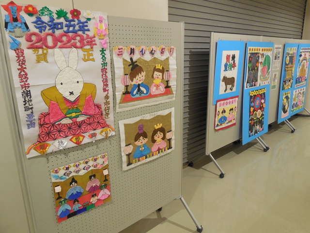 ▲2階廊下の貼り絵等の展示のようす
