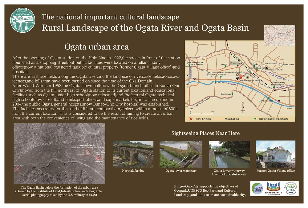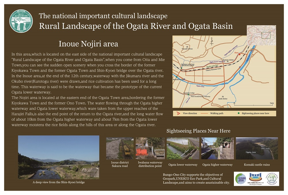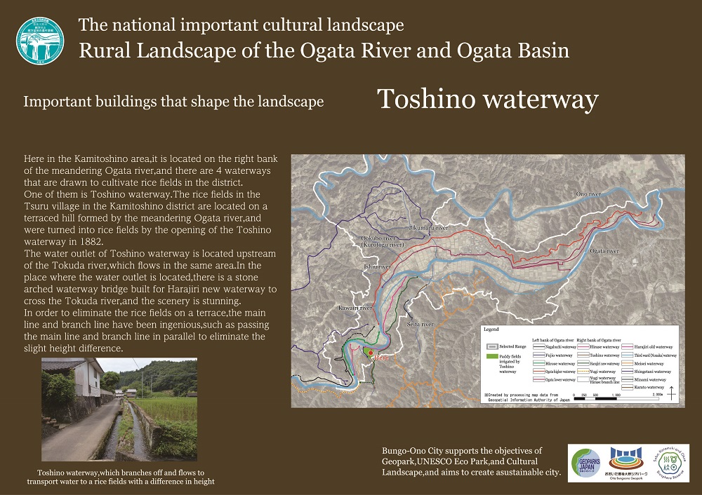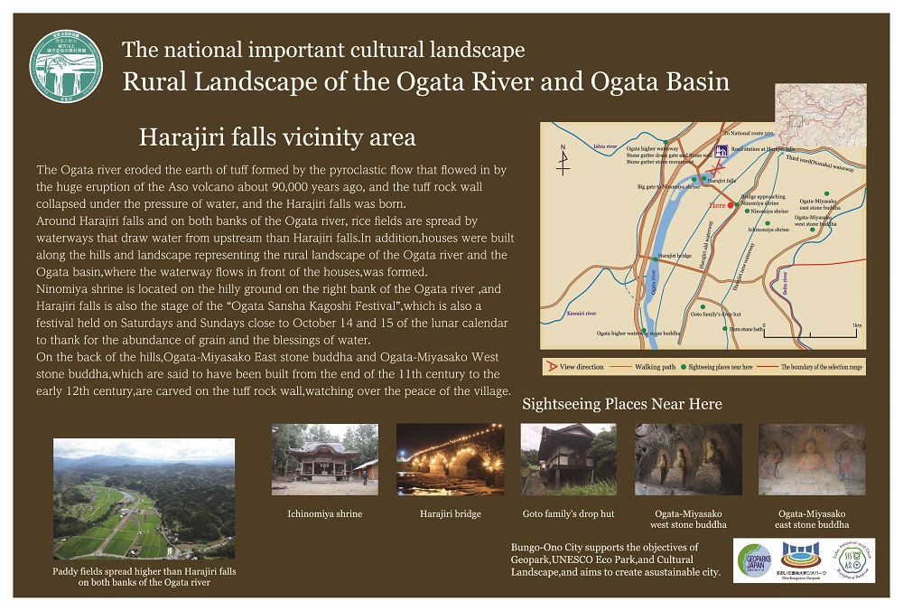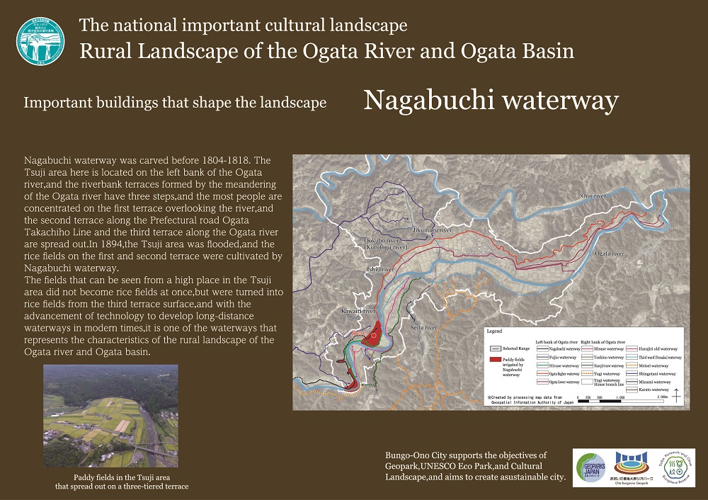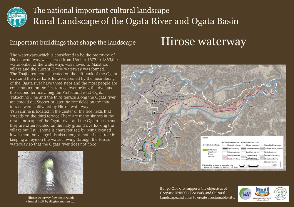 豊後大野市の西部に位置する緒方盆地は、阿蘇火山由来の溶結凝灰岩が覆う丘陵地帯に位置する。盆地中央を蛇行する緒方川の侵食により形成された河岸段丘は、丘陵地帯にあって稀有なまとまった平地であるが、川面と大きな高低差がある。そのため緒方盆地では、古くから灌漑用水を得るための努力が行われており、平安末期には緒方三郎惟栄により低位段丘を潤す井路が、近世には岡藩により中位段丘を潤す井路が整備され、藩屈指の稲作地帯となった。近代には、丘陵上に長距離水路が整備され、高位段丘と丘陵部に棚田が開かれた。このように、水路開削により稲作地帯として発展を遂げてきた農村の変遷を伝える貴重な景観となっている。河川、水田、井路、集落、山林が連なる土地利用の維持、また、井路網や石橋、磨崖仏や石風呂等、人々が時代ごとの技術を用いて溶結凝灰岩を開発に生かし、生活と結びついた文化や信仰を育んできたことを伝える要素が至るところに残されている。