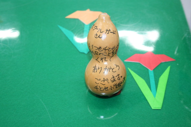 ▲スクールガードの方々へ贈呈されたひょうたんのマスコット。感謝の言葉が書かれています。