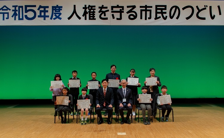 まず始めに、今年度の人権標語・ポスターの応募作品2,500点余の中から、優秀賞に選ばれた12人の方に表彰を行いました。