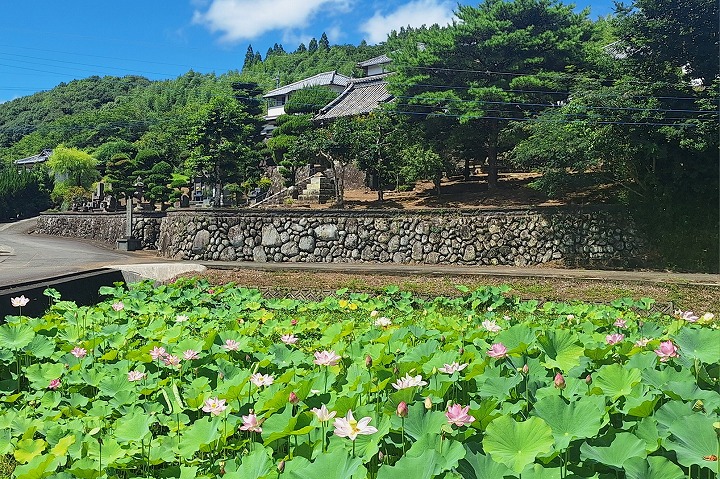 この蓮の花は、新福寺の住職・河野完道さんと檀家の方が、平成28年頃から栽培を始めて、毎年手入れをしながら大切に咲かせてきた花です。