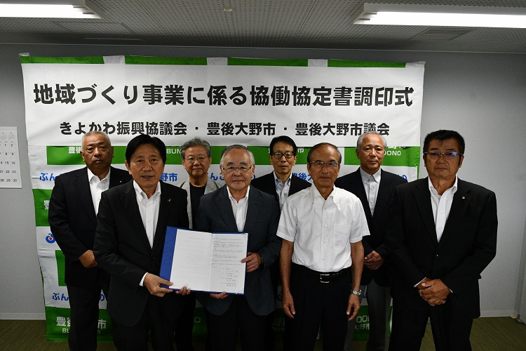今回は、清川町が町全体を1つの区域として、市内で11番目となる振興協議会を8月2日に設立し、当日、市役所において協定書の調印式を行いました。