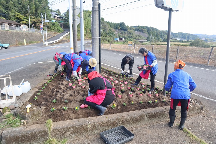 令和7年11月7日(金曜日)、豊後大野市商工会女性部千歳支部の会員さんが、県道の花壇の花植を行いました。