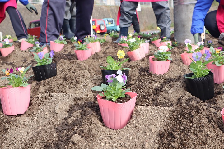 会員さんは、花壇の雑草を抜いて溝を掘り、土に水を差した後に、約200本のビオラを丁寧に、心を込めて植えました。
