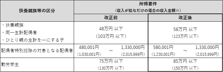 所得税の基礎控除の改正に伴い、下表のとおり扶養控除等の対象となる扶養親族等の所得要件が改正されました。